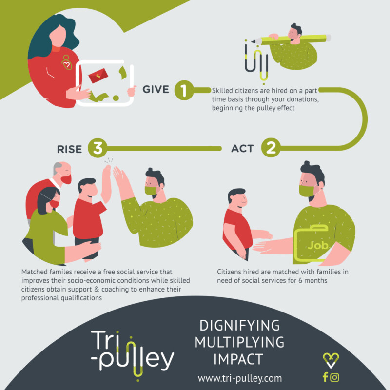 Tri-pulley works on creating paid temporary job opportunities for skilled individuals who will in return service, for free, other vulnerable families, small businesses, NGOS or initiatives. Thus through Tri-pulley’s Model, these skilled individuals contribute to solving or mitigating a social problem when matched with an individual or entity needing their skills.